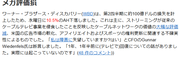 $WBD メガ評価損 ワーナー・ブラザース・ディスカバリーは、第2四半期に約100億ドルの損失を計上したため、水曜日に10.5%のAH下落しました。 Warner Bros. Discovery GAAP EPS of$4.07 misses by $3.88, revenue of $9.71B misses by $360M seekingalpha.com/news/4136458… pic.x.com/qxndngd8h3