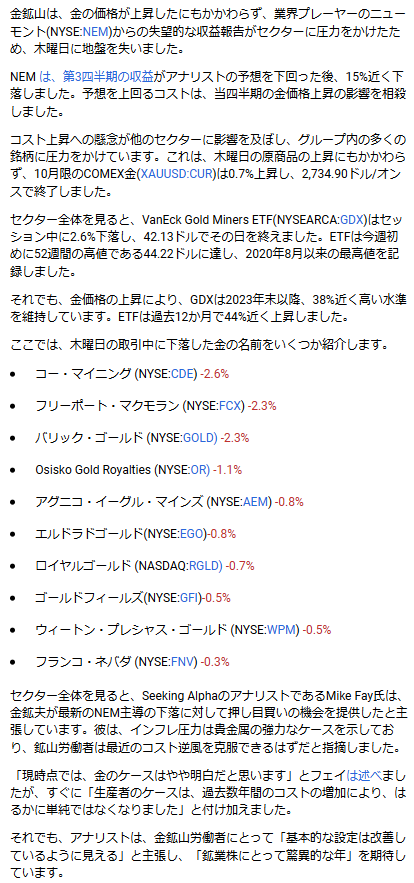 $GDX $NEM $GOLD Gold miners drop as Newmont's earnings disappointment fuels cost concerns seekingalpha.com/news/4202591… Oct. 24, 2024 8の収益への失望がコスト懸念を煽る中、金鉱山会社は下落 pic.x.com/UWJd7c9c30