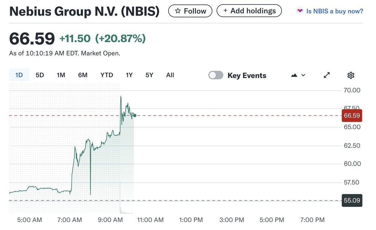 $NBIS +21%🚀 Nebius、予想を上回る決算と通期ガイダンス上方修正で急騰🚀 AI hyperscaler Nebius surges more than 20% on Q2 results .com/news/4481430… pic.x.com/H4uNaVcUN3