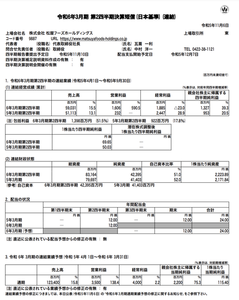 松屋フーズHD 2024年3月期第2四半期決算 : 官報ブログ