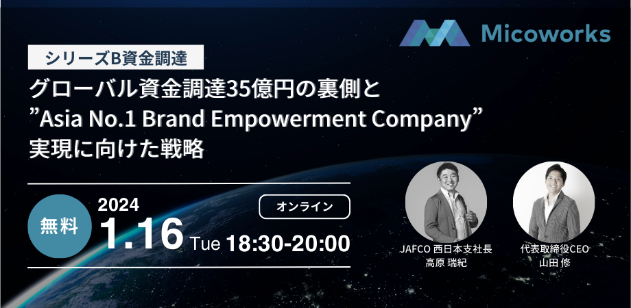 イベントやるよー! グローバル資金調達35億円の裏側と”Asia No.1 Brand Empowerment Company”の実現に向けた戦略 開催日時年1月16日18.peatix.com Micoworks株式会社 代表取締役社長 山田 修 ジャフコグループ株式会社 西日本支社長 パートナー 高原 瑞紀氏