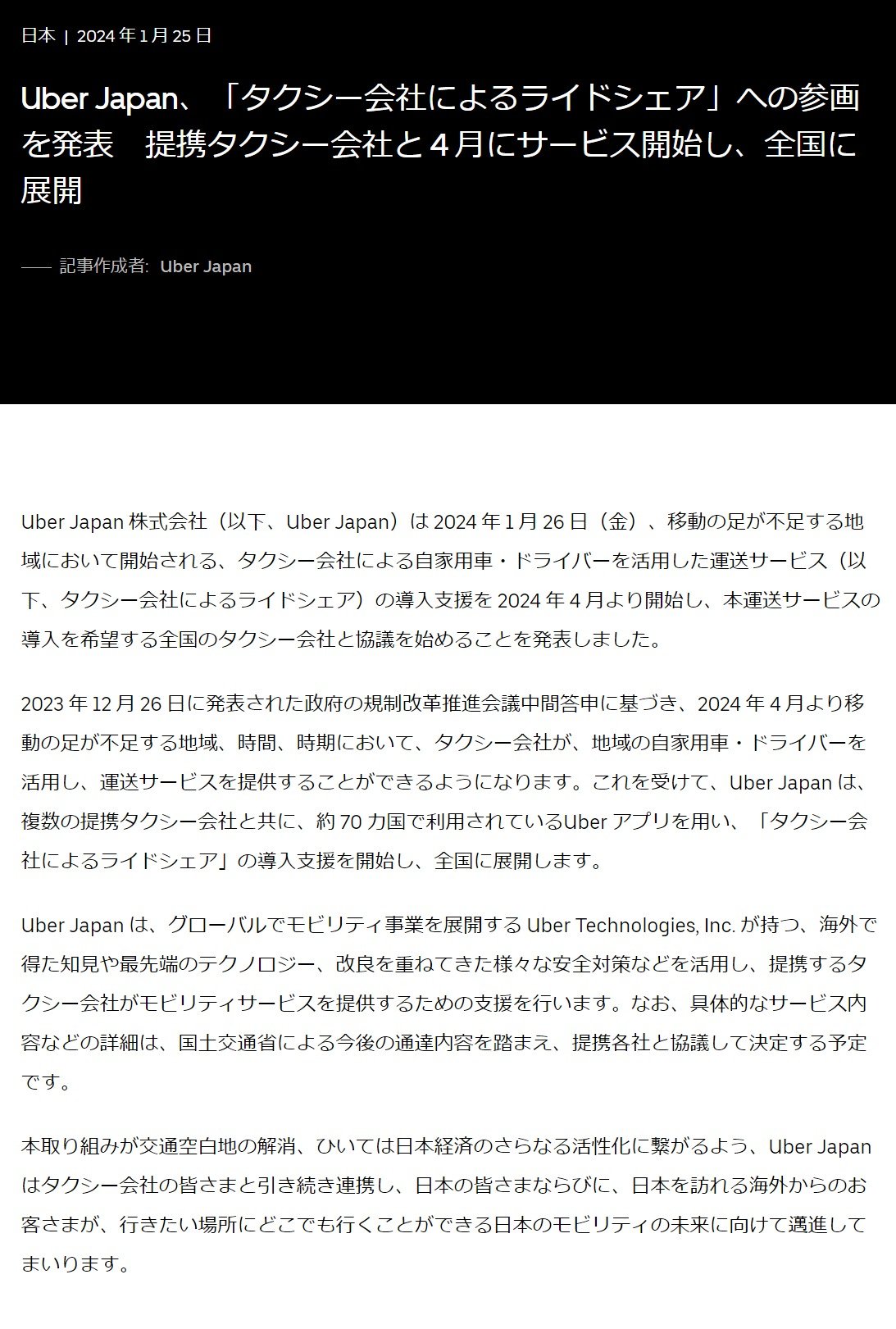 Uber Japan、日本版ライドシェア参加へ タクシー会社と協議