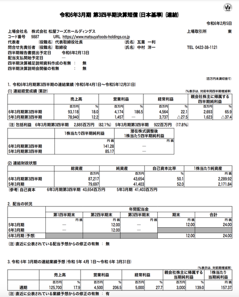 松屋フーズHD 2024年3月期第3四半期決算 : 官報ブログ