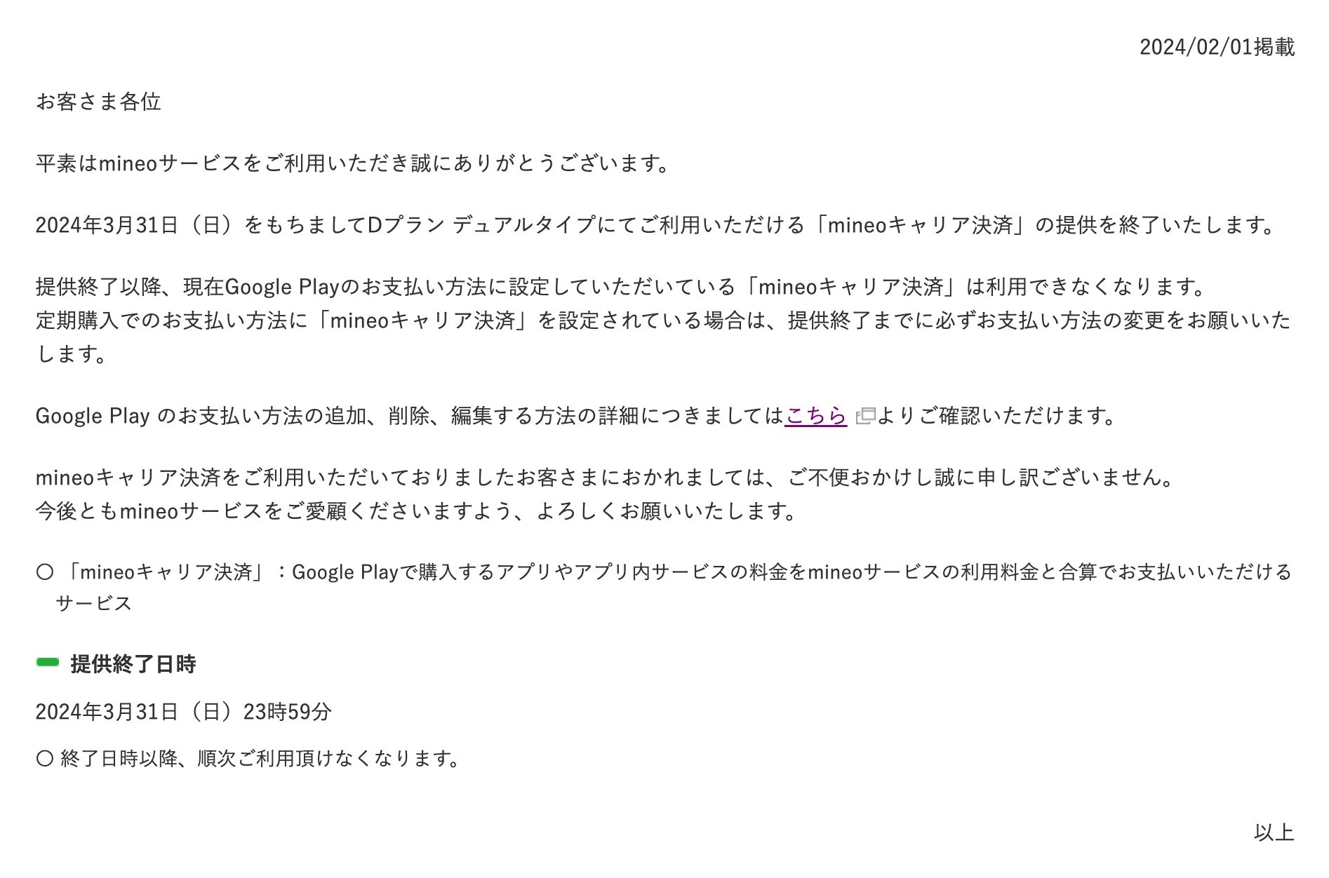 mineoキャリア決済、3月31日で終了 同日以降はGoogle Playでの支払いなどに利用できず