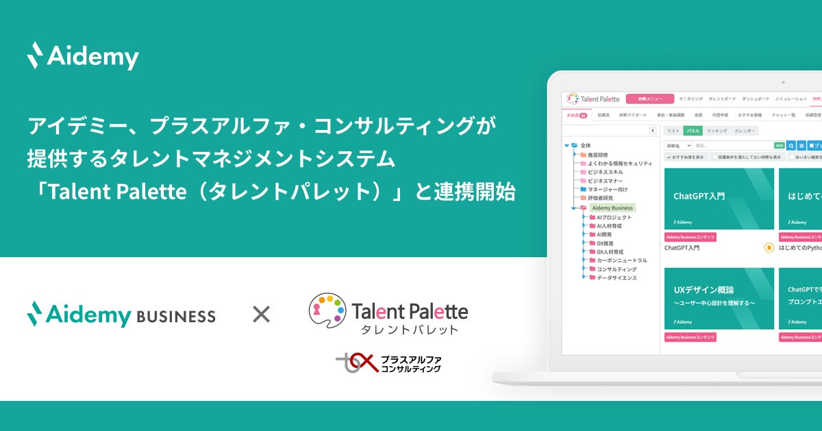 【アイデミー、「Talent Palette」と連携開始予定】 アイデミーはタレントマネジメントシステム「Talent Palette」を運営するプラスアルファ・コンサルティングと連携。同システム上でAidemy Businessのコースを受講できるほか、販売代理店としての提携も開始します。 prtimes.jp/main/html/rd/p…
