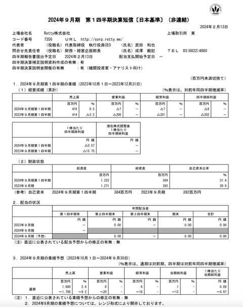 Retty 2024年9月期第1四半期決算 : 官報ブログ