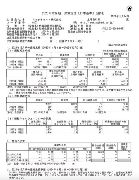 AppBank 2023年12月期通期決算 : 官報ブログ