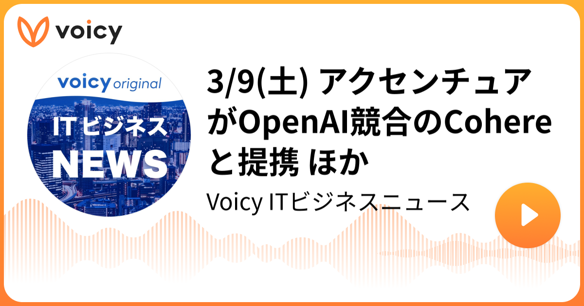 3/9(土) アクセンチュアがOpenAI競合のCohereと提携 ほか | ITビジネスニュース「Voicy ITビジネスニュース」/ Voicy - 音声プラットフォーム
