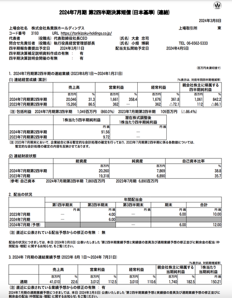 鳥貴族HD 2024年7月期第2四半期決算 : 官報ブログ