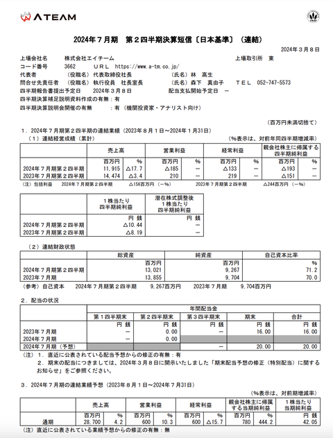 エイチーム 2024年7月期第2四半期決算 : 官報ブログ