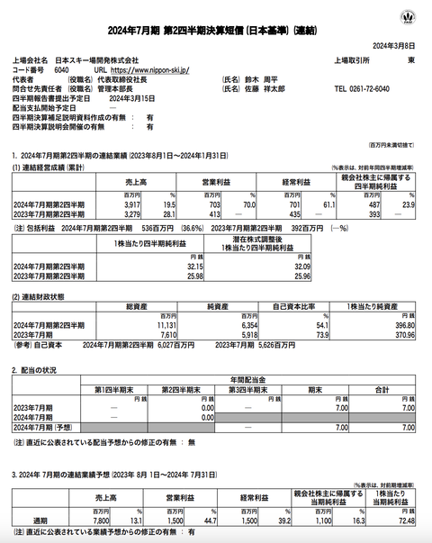 日本スキー場開発 2024年7月期第2四半期決算 : 官報ブログ