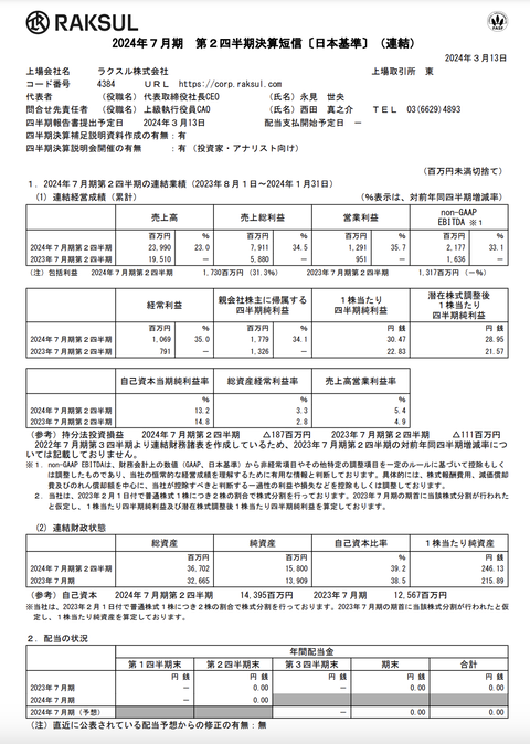 ラクスル 2024年7月期第2四半期決算 : 官報ブログ