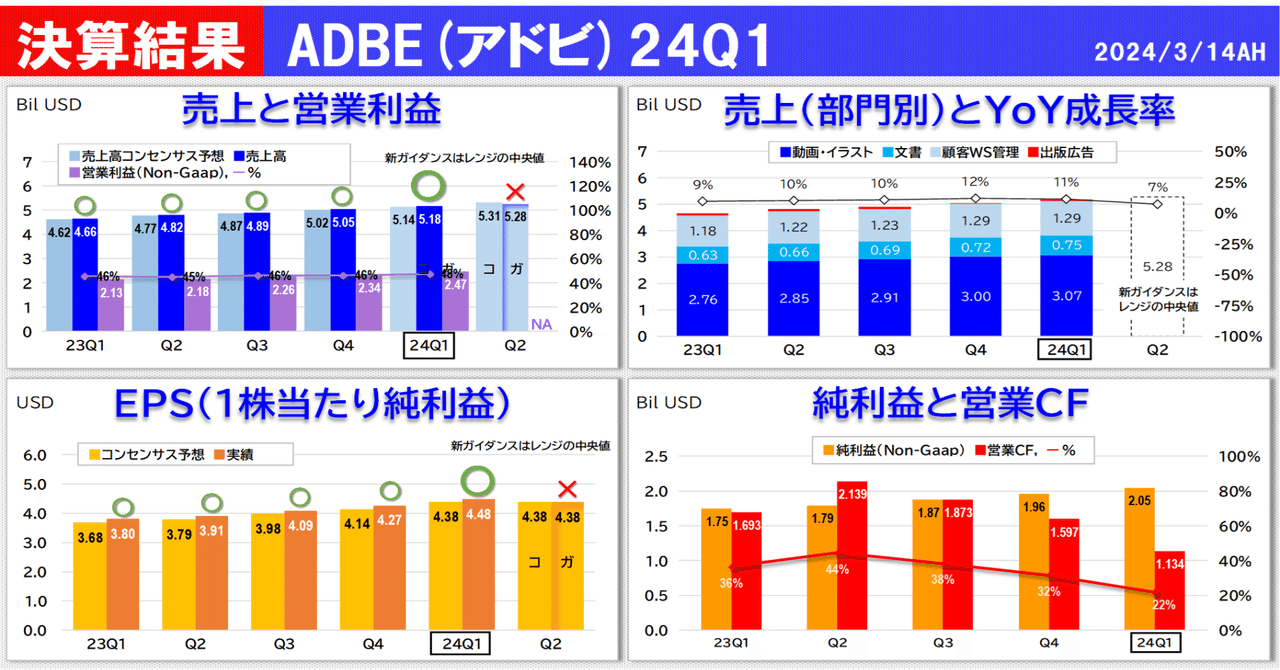 $ADBE アドビ 24Q1の決算結果 24Q1 ⭕️売 5.18B$, YoY+11% 内訳 動画・イラスト +11% 文書 +18% 顧客WS管理 +10% ⭕️EPS 4.48$, YoY+18% 24Q2 ❌売 5.25~5.30B$ ⭕️EPS 4.35~4.40$ 詳細はこちら👇 note.com/cafeluv/n/ne53…