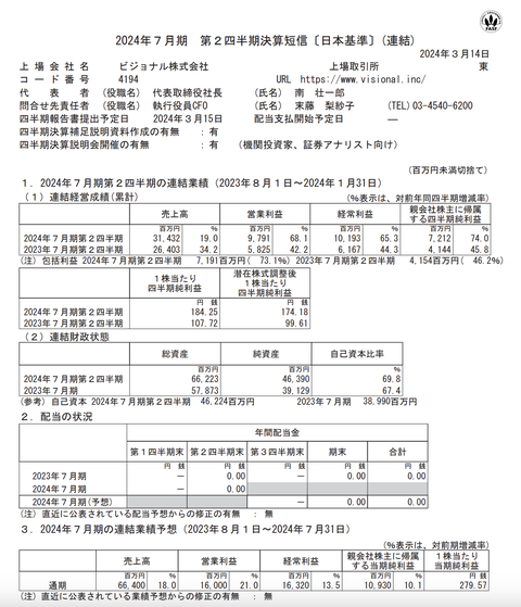 ビジョナル 2024年7月期第2四半期決算 : 官報ブログ