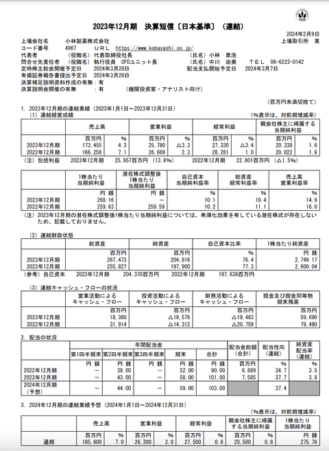小林製薬 2023年12月期通期決算 : 官報ブログ
