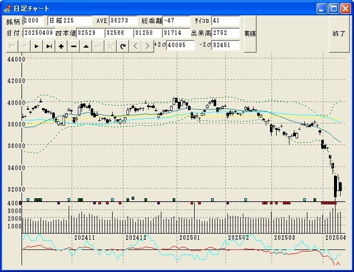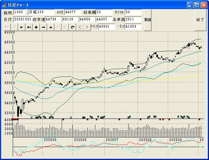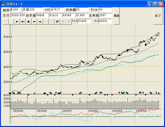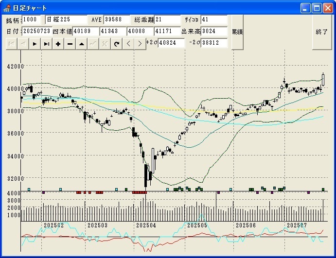 今後の日経平均の見通し yslab.blogspot.com 目先は、BB+2σ+100円が上値の目安に、BB+1σ+1000円が下値の目安。 日経平均は大幅に続伸しました。この先も、ハイテク株や半導体関連株の決算にサプライズがなければ、まだ上昇傾向は続きそうです pic.x.com/0cFniqforp