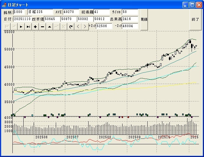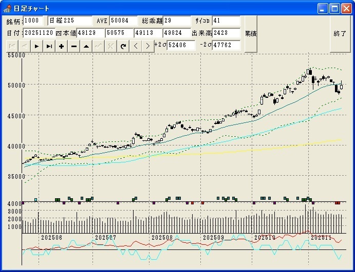 今後の日経平均の見通し yslab.blogspot.com 11月26日の日本市場では、前日の米株高で、AI関連株や好業績銘柄を中心に買いが優勢。日銀の利上げ観測を受けて銀行株が買われたほか、原発再稼働への期待から電力株にも買い。ただ、節目の5万円に近付くと、上値が重くなりました。