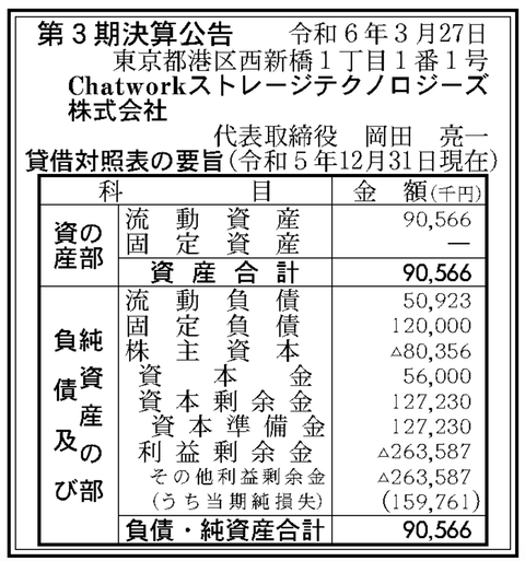 法人向けオンラインストレージサービスのセキュアSAMBA運営「Chatworkストレージテクノロジーズ」決算公告(第3期) : 官報ブログ