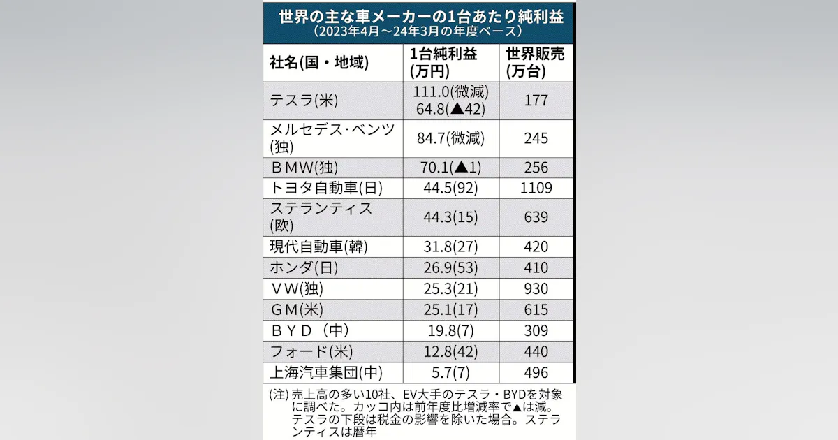 高級車堅調、首位はテスラ 世界の車1台あたり利益額 23年度、伸び率日本勢健闘 - 日本経済新聞