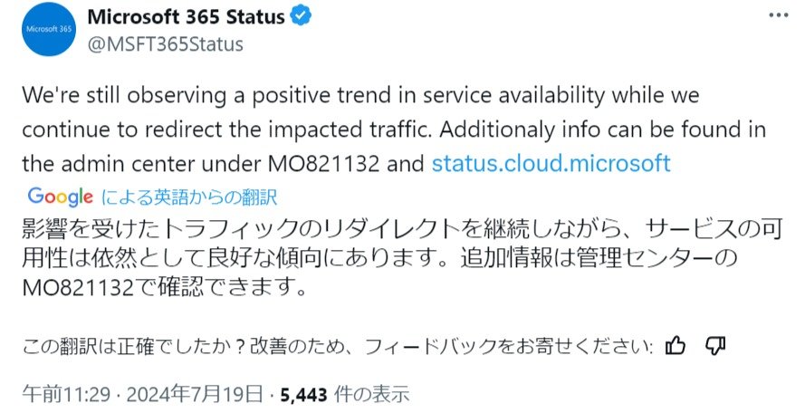 今日は二つの世界的システム障害が同時に起きて大変だな。 「Microsoft 365」で障害が発生し、OneDriveのファイルが更新できなかったり、Teamsのステータスが変更できないなどの問題が出た。 ソース.app/j4qcW1YgcwZpUw…