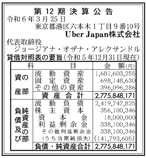 Uber日本法人「Uber Japan」決算公告(第12期) : 官報ブログ