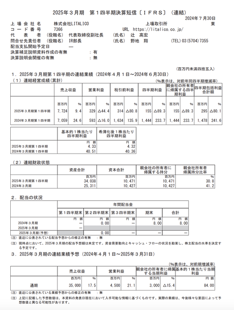 LITALICO 2025年3月期第1四半期決算 kanpo.blog.jp/archives/42876… 売上収益億2400万円 営業利益億2900万円 純利益億5500万円 ※IFRS