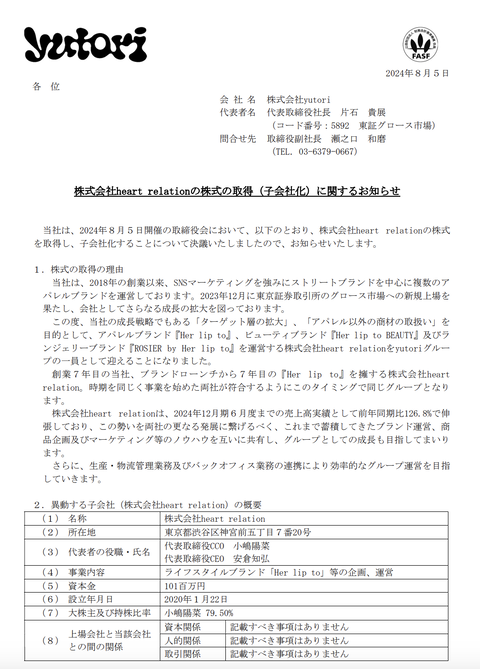 yutoriが小嶋陽菜氏プロデュースのライフスタイルブランド「Her lip to」を運営するheartrelation を子会社化 16.8億円で51.0%取得 : 官報ブログ