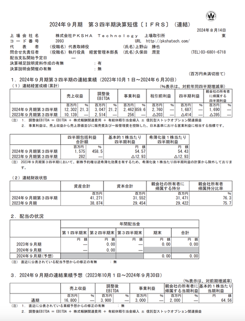 PKSHA Technology 2024年9月期第3四半期決算 : 官報ブログ