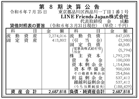 LINEのキャラクターブランド展開など「LINE Friends Japan」決算公告(第8期) : 官報ブログ