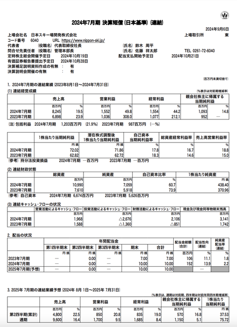 日本スキー場開発 2024年7月期通期決算 : 官報ブログ