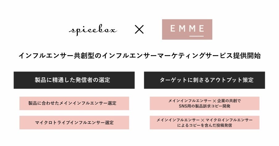 スパイスボックス、総フォロワー数170万人超えの美容コスメメディア「EMME」と業務提携。インフルエンサー共創型のインフルエンサーマーケティングサービスを提供開始