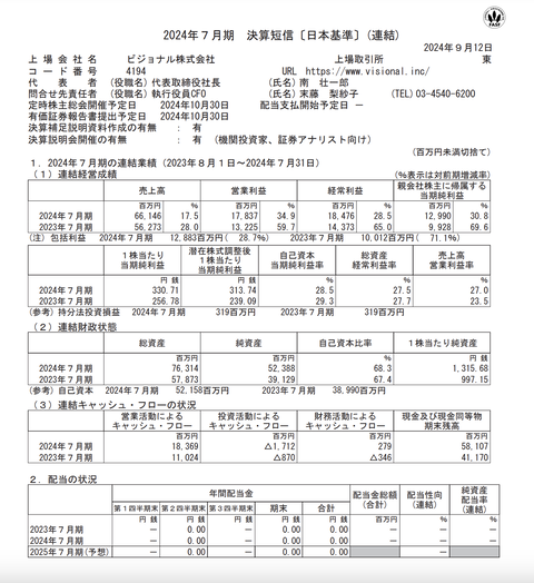 ビジョナル 2024年7月期通期決算 : 官報ブログ
