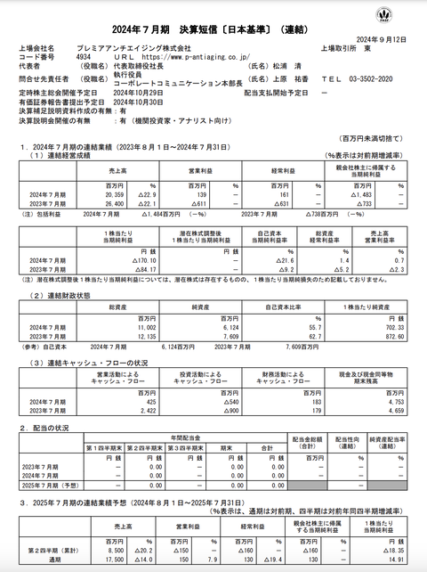 プレミアアンチエイジング 2024年7月期通期決算 : 官報ブログ