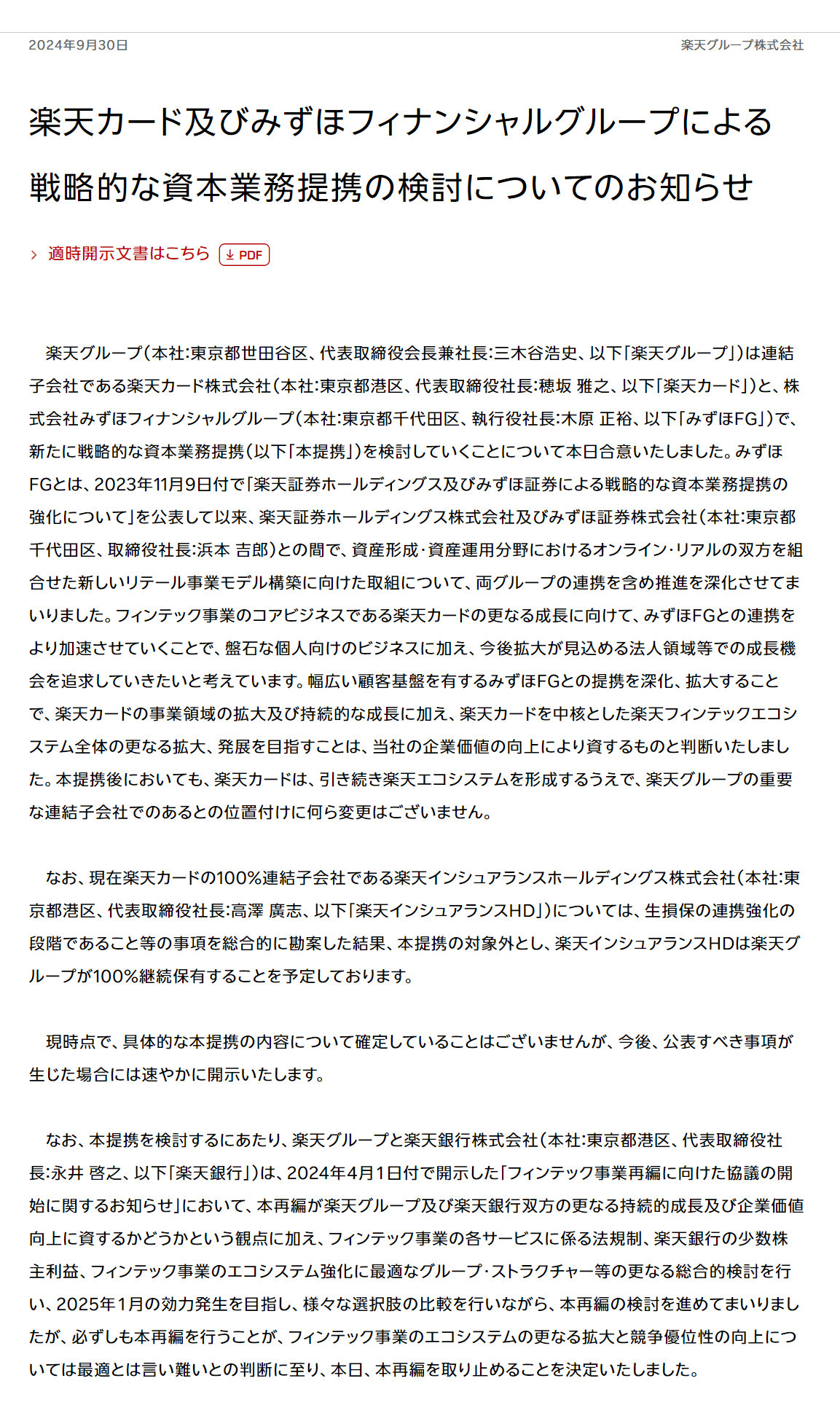 楽天カードとみずほFG、資本提携を検討 楽天Gの金融子会社再編は中止