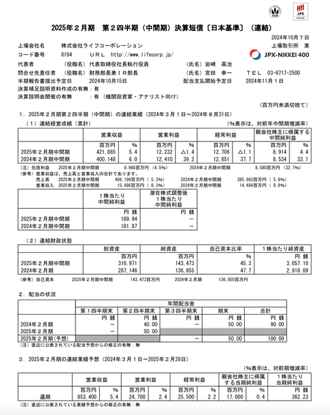 ライフコーポレーション 2025年2月期第2四半期決算 : 官報ブログ
