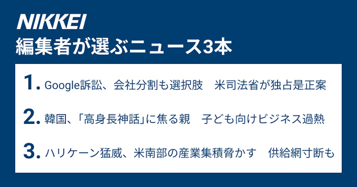 Google独占是正案・韓国の高身長神話・米ハリケーン猛威 編集者が選ぶニュース3本 - 日本経済新聞