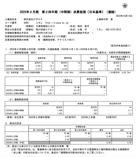 ビザスク 2025年2月期第2四半期決算 : 官報ブログ