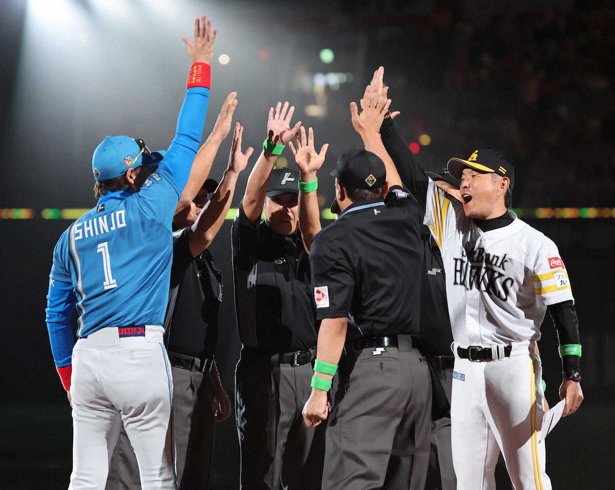 パCSファイナルS 日本ハム、ソフトバンクの両監督と審判団が異例の円陣 互いの健闘誓い合う - スポニチ Sponichi Annex 野球
