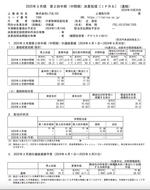 LITALICO 2025年3月期第2四半期決算 kanpo.blog.jp/archives/43410… LITALICO 中間決算。増収減益 売上収益億2400万円 営業利益億3700万円 純利益億2700万円 ※IFRS