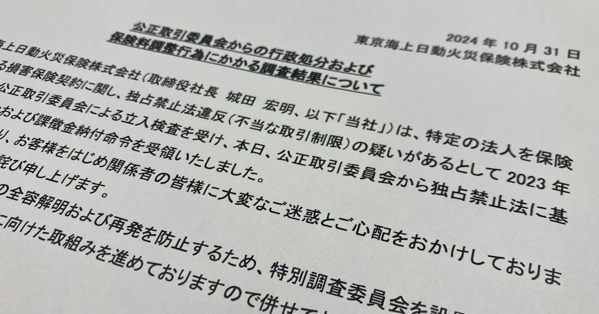 東京海上日動火災保険の保険料調整 営業部門6割で確認 - 日本経済新聞