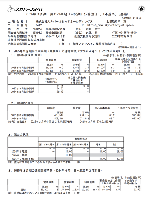 スカパーJSATホールディングス 2025年3月期第2四半期決算 : 官報ブログ
