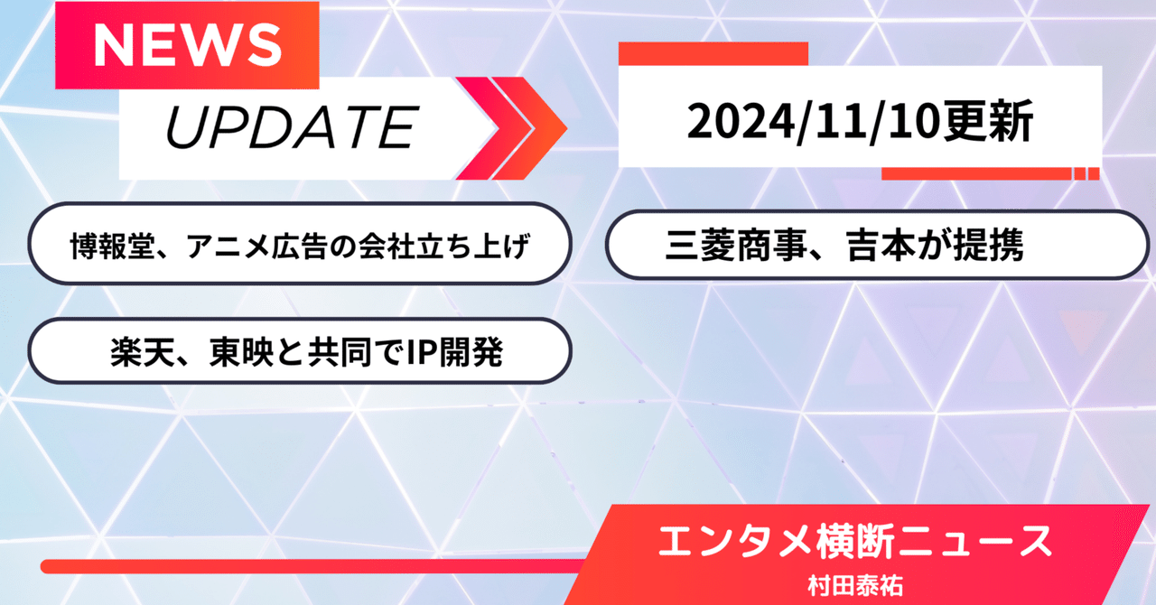 【エンタメ横断ニュース】博報堂がアニメ広告会社立ち上げ、三菱商事と吉本が提携、楽天と東映が共同でIP開発(24/11/10)|村田泰祐