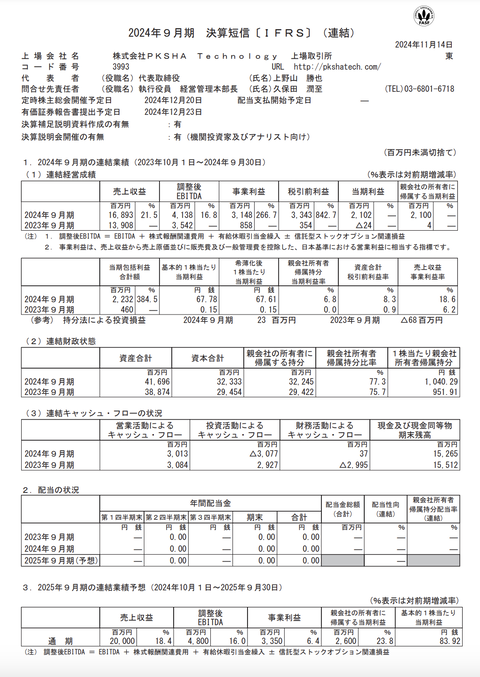 PKSHA Technology 2024年9月期通期決算 : 官報ブログ
