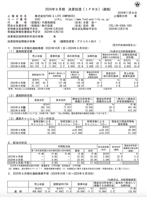 FOOD & LIFE COMPANIES 2024年9月期通期決算 : 官報ブログ