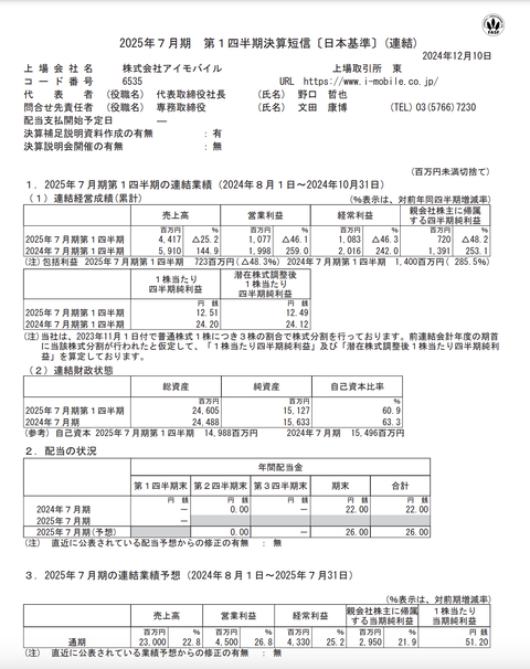 アイモバイル 2024年7月期第1四半期決算 : 官報ブログ