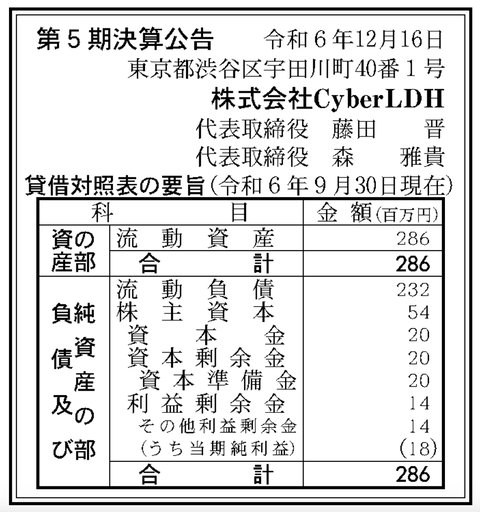 サイバーエージェントとLDH JAPANの合弁会社「CyberLDH」決算公告(第5期) : 官報ブログ