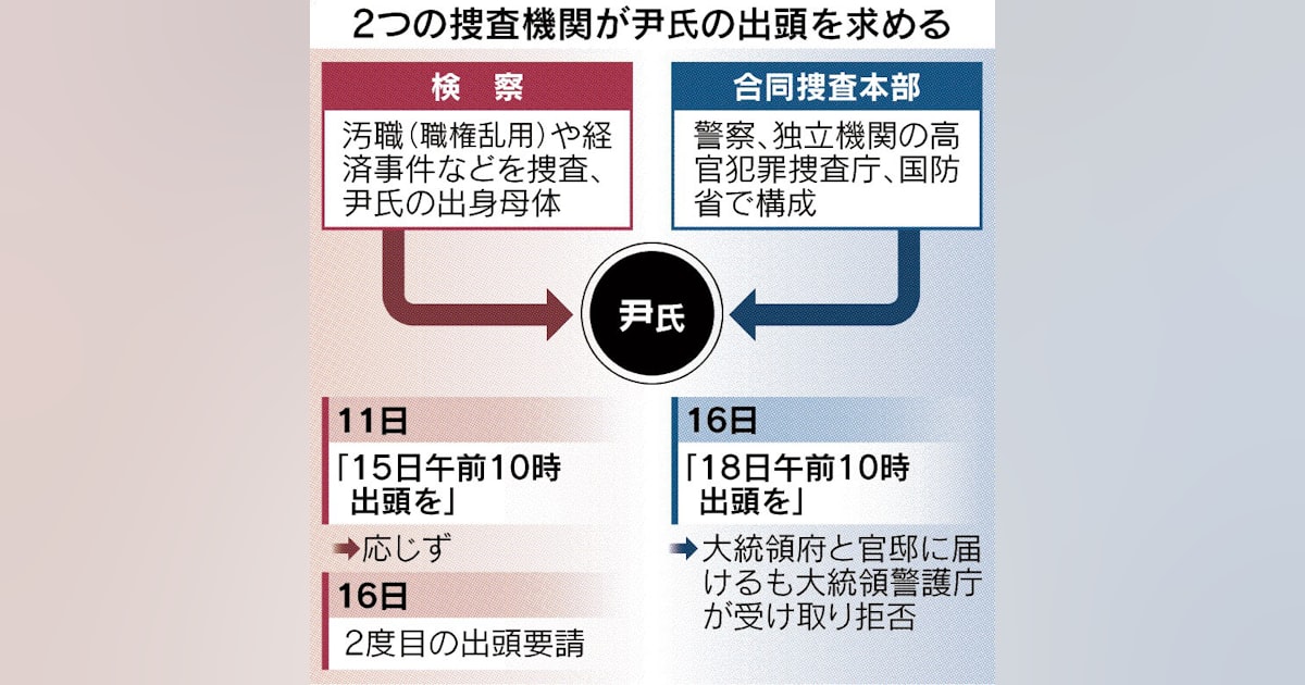 尹氏に検察が再び出頭要請 警察など合同捜査本部も 大統領府とにらみ合い 強制捜査は難航必至 - 日本経済新聞