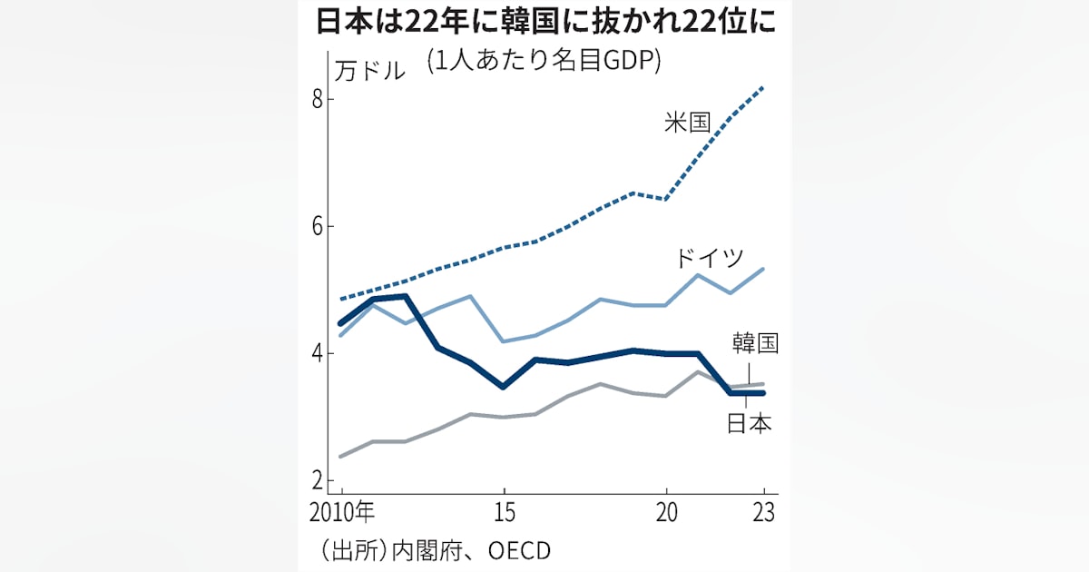 1人あたり名目GDPで日本22位、韓国に逆転許す 22年 - 日本経済新聞