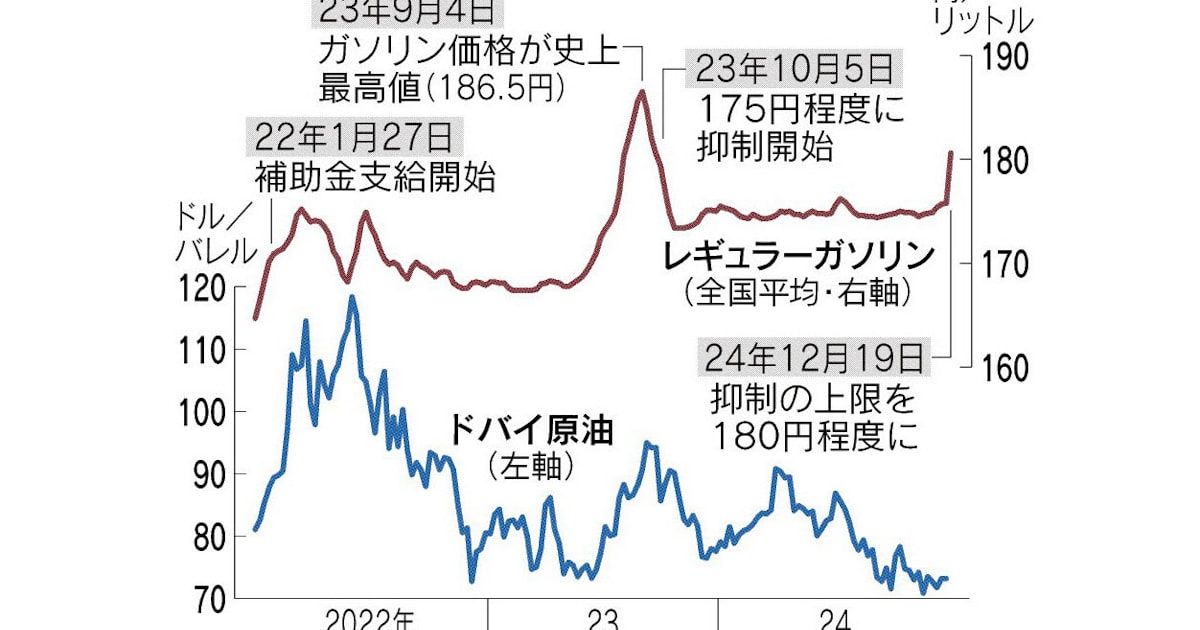 ガソリン、1年ぶり180円台に上昇 補助金縮小が影響 円安圧力、政策出口見えず - 日本経済新聞