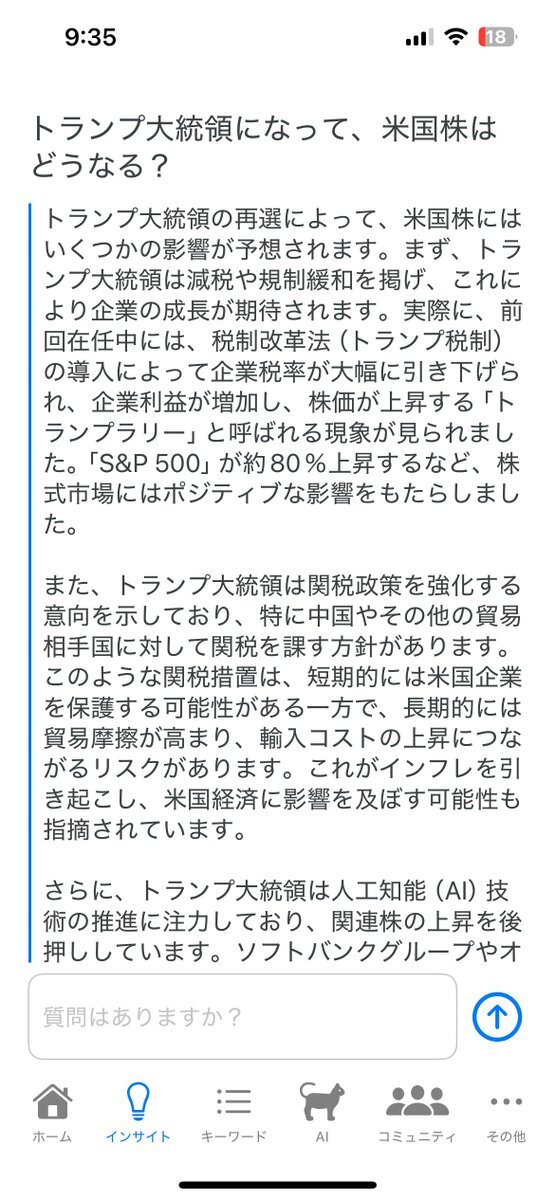 【トランプ大統領就任による米国株への影響をAIに聞いてみた】 AIの予測に、あなたは賛成?反対? .com #トランプ大統領 #米国株 #株式投資 #AI pic.x.com/UPWlavlFpP